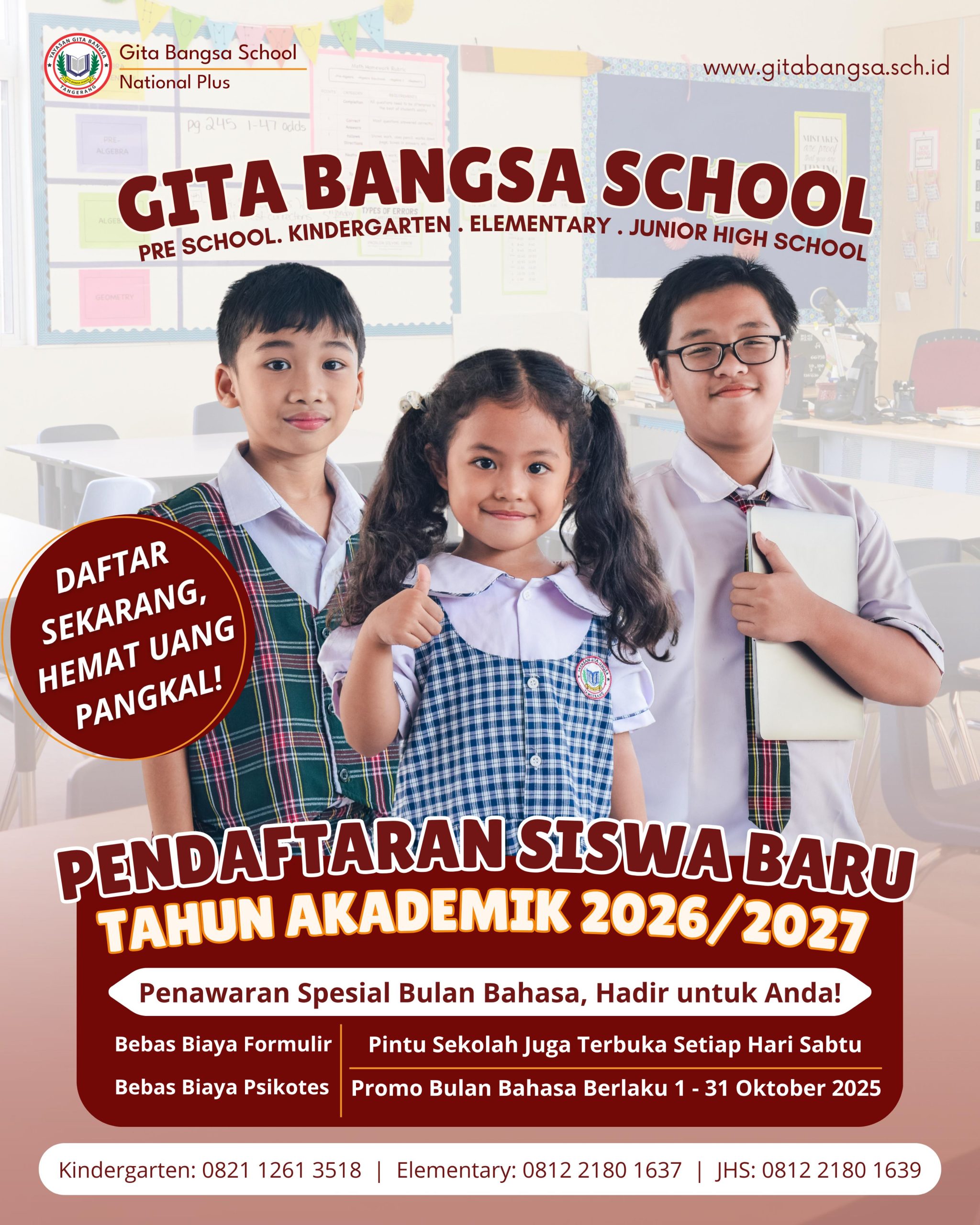 Gita Bangsa menawarkan pendidikan yang holistik dan terpadu melalui tiga unit sekolahnya: TK, SD, dan SMP. Setiap unit pendidikan ini dipayungi oleh satu visi dan misi yang sama serta didukung oleh kurikulum yang selaras, memastikan kesinambungan dalam pembelajaran dan pengembangan karakter siswa. Dengan pendekatan yang menyeluruh, kami memberikan fondasi yang kuat sejak usia dini hingga remaja, mempersiapkan mereka untuk menghadapi tantangan di setiap tahap pendidikan berikutnya.